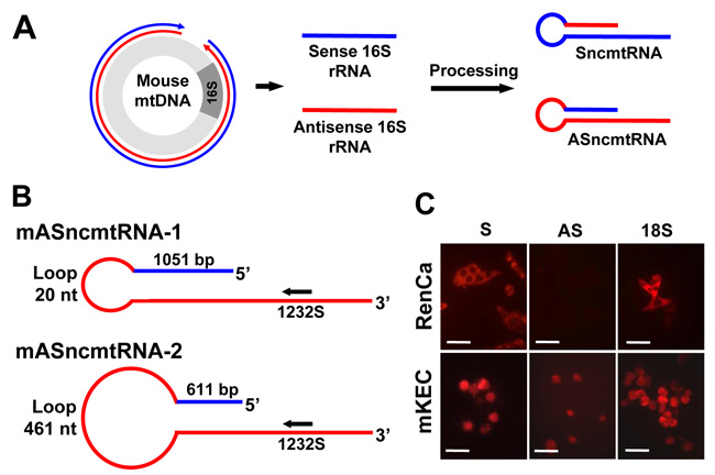 Figure 1: Expression of the mSncmtRNA and the mASncmtRNAs in normal mouse kidney epithelial cells (mKEC) and RenCa cells. A. Scheme depicting the putative origin of the mouse ncmtRNAs. Segments generated from bidirectional transcription of the 16S region of the mouse mtDNA are processed to give rise to the SncmtRNA and the ASncmtRNAs. In blue, heavy-strand transcript; in red, light-strand transcript. B. Schematic representation of the mASncmtRNA-1 and -2, indicating the size of the loop, the length of the IR and position of ASO-1232S used in this study. C. FISH of mSncmtRNA and the mASncmtRNAs in RenCa and mKEC cells (Bars = 25 μm).