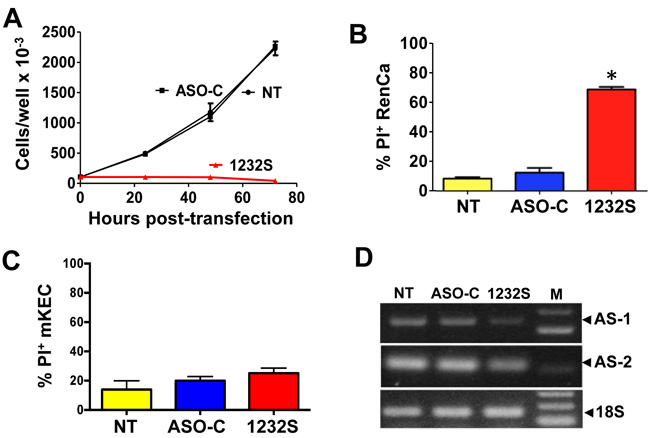Figure 2: ASK induces inhibition of proliferation and death of RenCa cells. A. RenCa cells (100,000/ well) were transfected in triplicate with 100 nM of ASO-C, or ASO-1232S or left untreated (NT). At 24, 48 and 72 h post-transfection, total cell number was determined. At 72 h, ASO-1232S induced drastic inhibition of cell proliferation compared to controls (*p < 0.005). B. Cells were treated as in (A) for 48 h. ASK induced over 70% cell death evaluated by PI staining and cytometric analysis (*p < 0,05). C. ASK of normal mKEC for 48 h does not induce significant death, compared to controls. D. After a 48 h treatment, knockdown of the ASncmtRNAs was confirmed by RT-PCR amplification of mASncmtRNA-1 (648 bp amplicon) and mASncmtRNA-2 (209 bp amplicon), using 18S rRNA (180 bp amplicon) as control (M, 100-bp ladder).