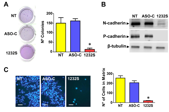 Figure 5: ASK inhibits tumorogenic and metastatic potential of RenCa cells. A. RenCa cells were transfected with 100 nM ASO-C or ASO-1232S or left untreated (NT) for 48 h. After harvesting and counting, 2,000 Tb-negative cells were seeded in soft agar (see Materials and Methods) and colonies >50 μm in diameter were scored at 2-3 weeks. A triplicate analysis showed that ASK inhibited colony formation by about 90% (*p < 0.005). B. ASK downregulates proteins involved in metastasis. RenCa cells were transfected as in (A) for 24 h and protein extracts were analyzed by Western blot with antibodies against N-cadherin and P-cadherin, using β-tubulin as loading control. Both cadherins were strongly downregulated by ASK. C. ASK inhibits invasiveness of RenCa cells. Cells (100,000) treated as in (A) for 48 h were grown over Matrigel-coated inserts. After 24 h, inserts were fixed in cold methanol, stained with DAPI and mounted in Mowiol. At least 10 fields were evaluated by fluorescence microscopy (Bars = 25 μm). A triplicate analysis showed that ASK induced an inhibition of around 90% in invasiveness of RenCa cells (*p < 0,001).
