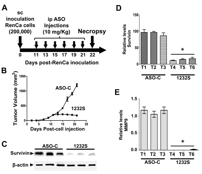 Figure 7: ASK in vivo induces downregulation of survivin and MMP9. Eight Balb/c mice were inoculated sc with 200,000 RenCa cells. Eleven days post-cell inoculation, mice contained tumors of about 200 mm3 and were randomized into 2 groups of 4 mice, which were treated by 6 ip injections on days 11, 13, 15, 17, 19 and 21 with 200 μg ASO-C or ASO-1232S in 200 μl saline. The day after the last injection, mice were euthanized and tumors were harvested and processed for Western blot. A. Scheme of the experiment. B. Growth curve of sc tumors, showing a drastic retardation in ASO-1232S treated mice, compared to controls. C. Representative blot of survivin in lysates of 3 tumors from each group. Tumors treated with ASO-1232S (T4, T5 and T6) exhibited downregulation of survivin, compared to ASO-C tumors (T1, T2 and T3). D. A triplicate analysis showing that ASK induced about 80% downregulation of survivin (*p < 0,001). E. Drastic downregulation of MMP-9 induced by ASK (*p < 0.0005).