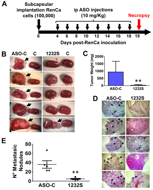 In order to determine the in vivo effect of ASO-1232S on orthotopic tumors, 10 Balb/C mice were inoculated as described above. After 4 days, the animals were randomized into 2 groups of 5 mice each and ip injected in a blinded fashion on days 4, 6, 8, 10, 12, 14, 16 and 18 with 250 μl saline containing 200 μg of either ASO-C (control) or ASO-1232S (Figure 9A). On day 19 post-cell inoculation, mice were euthanized and the lungs and both kidneys were removed and fixed. In one representative assay and, in contrast to the control group which contained large renal tumors, 4 mice treated with ASO-1232S showed total absence of tumor, while one mouse contained a small tumor (Figure 9B, arrows). Tumor weight was estimated subtracting the right kidney from the left kidney showing that ASK was higly effective in inhibiting tumor growth (Figure 9C). The number of lung metastatic nodules in animals treated with ASO-1232S was considerably and significantly lower than the controls (Figure 9D, 9E).