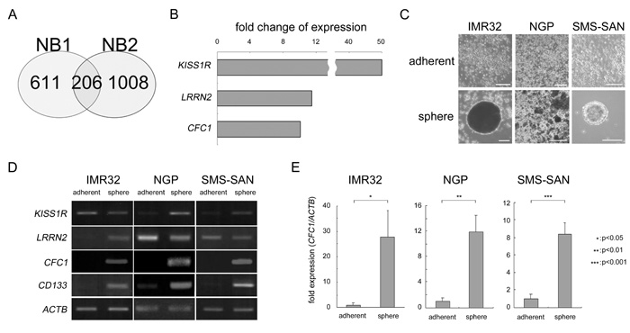 Figure 1: Target molecule selection by the cancer stem cell model in NB. A. Venn diagram of the overlap among up-regulated genes in NB1 and NB2 tumor spheres. Genes up-regulated by more than 2-fold in spheres from tumor tissues and related to an unfavorable prognosis were selected using microarrays and a survival data analysis. B. Fold changes in three genes ranked in the Top 15 functioning as cell surface receptors or co-receptors (Supplementary Table 2). C. NB cell lines were cultured in six-well culture plates with normal (adherent) or sphere-forming medium for 3 weeks (sphere). Bar, 50 μm. D. Semi-quantitative RT-PCR was performed using specific primers against KISS1R, LRRN2, CFC1, and CD133. ACTB was used as a loading control. E. Quantitative PCR (qPCR) analysis of CFC1. Relative CFC1 values were normalized by ACTB values. Data are representative results of three independent experiments. A statistical analysis was performed using the Student’s t-test.
