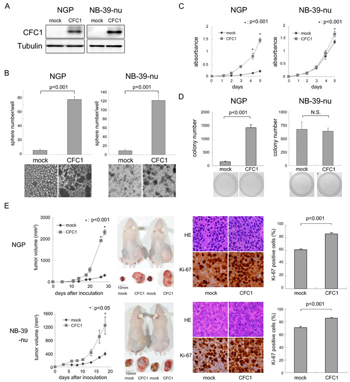 Figure 3: CFC1 accelerates NB tumor formation and aggressiveness. A. CFC1 transduction by lentivirus infection. NGP and NB-39-nu cells were infected with a mock or CFC1-expressing lentivirus. A Western blot analysis of CFC1 was performed. Tubulin was used as a loading control. B. After a 10-day culture in SFM, spheres were counted under a microscope. C., D. The WST-8 assay and soft agar colony formation assay were performed using CFC1-expressing NB cells. Data are representative results of five (C) and four (D) independent experiments. E. Tumor development in BALB/c AJcl nu/nu mice following an injection of mock (mock) and CFC1-expressing (CFC1) NB cells. Tumor volumes were measured every 2 or 3 days. Data are presented as the mean ± SE of tumors in four mice. Immunohistochemistry was performed using hematoxylin-eosin and Ki-67. The % of Ki-67-positive cells was counted. Data are shown as the percentages of Ki-67-positive cells/field (mean ± SD) in at least three independent fields. Statistical analyses were performed using the Student’s t-test. The original magnification of each panel is ×400.