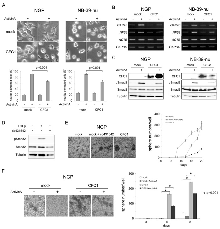 Figure 5: CFC1 inhibits Activin-induced NB cell differentiation and Smad2 activation. NGP and NB-39-nu cells were infected with a mock or CFC1-expressing lentivirus (CFC1). A. Mock and CFC1-expressing cells were treated with (+) or without (-) 3 nM of Activin A. Neurite elongation was scored by the presence of neurites longer than one cell in diameter 72 h after the treatment (photo and bar graphs). B. The expression of the NB differentiation-related molecules NF68 and GAP43 was assessed by RT-PCR. GAPDH was used to confirm control ACTB expression in the presence of Activin A. C. The protein levels of CFC1, phospho-Smad2, total-Smad2, and tubulin were analyzed by a Western blot analysis. D. NGP cells were cultured with 10 μM of the Activin receptor inhibitor sb431542 overnight and treated with 5 ng/ml of TGFβ for 2 h. The level of phosphorylation of Smad2 was assessed by a Western blot analysis. E. NGP cells were cultured in SFM with or without sb431542. CFC1-overexpressing cells (CFC1) were also cultured as a control. F. Mock and CFC1-overexpressing NGP cells were treated with 3 nM Activin A. Sphere numbers were counted on days 3, 6, and 8. All data are presented as the mean ± SD of at least three independent experiments. Statistical analyses were performed using the Student’s t-test.