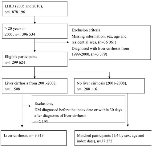 The study participants included 1 878 196 enrollees sampled from the LHID 2005 and 2010 (Figure 1). All participants were aged 20 years and older. Newly diagnosed cirrhotic patients and their matched controls (comparison individuals) were identified from January 2001-December 2008 and matched 1:4 by age, sex and index date. The index date was the first date of cirrhosis detection. The event date was the first date of T2DM diagnosis or prescription of antihyperglycemic agents. Censoring occurred in case of death or withdrawal from the study. Patients were defined as having alcoholic cirrhosis if they had one inpatient and/or two outpatient claims with reported ICD-9 CM Code: 571.2. Cirrhosis without alcohol was identified using the ICD-9 CM Code: 571.5, 571.6. Patients were classified as having type 2 diabetes mellitus if they had one one inpatient and/or two outpatient claims with reported ICD-9 CM codes: 250.xx, 790.21, 790.22, 791.5x, A181. Patients were also classified as having T2DM if they were prescribed antihyperglycemic agents (alpha-glucosidase inhibitor, biguanides, insulin, meglitinides, sulfonylureas and thiazolidinediones) from 2001-2011.