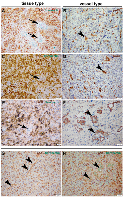 Figure 2: Immunohistochemical double-staining of GBM tissue samples with antibodies against P-AXL (brown) and fibronectin (green) revealed three main P-AXL expression patterns. In samples classified as “tissue type”, P-AXL expression was mainly seen in areas of hypercellularity (A., C., E.). Tumor vessels which were highlighted by fibronectin staining were negative for P-AXL (arrows). Samples classified as “vessel type” showed exclusive P-AXL staining within the tumor vasculature (B., D., F.; arrowheads). The third pattern was characterized by P-AXL expression in both, the tumor tissue and vasculature (G., H.). P-AXL expression was detected in tubular (B., D., G.; arrowheads) and glomeruloid (F., H.; arrowheads) vascular proliferation. (Scale bar: 50 μm A.-D., F.-H.; 20 μm E.).