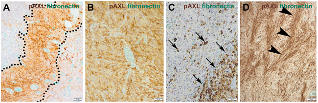 Immunofluorescence and immunohistochemical stainings were performed on formalin-fixed, paraffin-embedded (FFPE) tissue sections according to standard procedures. The following primary and secondary antibodies were used: polyclonal rabbit anti-GFAP (1:2000, Dako), monoclonal mouse anti-CD31 (1:100, clone JC70A, Dako), monoclonal mouse anti-MAP2 (1:10000, clone HM-2, Sigma Aldrich), monoclonal mouse anti-α-smooth-muscle actin (aSMA, 1:200, clone 1A4, Dako), monoclonal mouse anti-Nestin (1:200, clone 10C2, Millipore), polyclonal rabbit anti-PDGFR-ß (1:10, Santa Cruz), polyclonal rabbit anti-ZEB1 (1:300, Sigma Aldrich), polyclonal anti-Fibronectin (1:1000, Sigma Aldrich), monoclonal mouse anti-phospho-AXL (pTyr779) (1:50, clone 713610, R&D Systems), polyclonal rabbit anti-phospho-AXL (pTyr691) (1:50, Sigma Aldrich), monoclonal rabbit anti-AXL C89E7 (1:100, Cell Signaling), FITC-conjugated donkey anti-rabbit IgG (1:1000, Dianova, 711-095-152), Alexa Fluor® 488-conjugated goat anti-rabbit IgG (1:1000, Dianova, 111-545-003), Alexa Fluor® 488-conjugated goat anti-mouse IgG (1:1000, Dianova, 115-545-003), Cy3-conjugated goat anti-mouse IgG (1:1000, Dianova, 115-165-003), Cy3-conjugated goat anti-rabbit IgG (1:1000, Dianova, 111-165-003), and Cy3-conjugated donkey anti-mouse IgG (1:1000, Dianova, 115-165-146). The immunofluorescence counterstaining was performed with VECTASHIELD® Mounting Medium containing 4’,6-diamidino-2-phenylindole (DAPI) (Vector Laboratories, Burlingame, CA). Immunohistochemical staining of FFPE tissue sections (4 μm-thick) was performed on a VENTANA Benchmark XT automated staining instrument according to the manufacturer’s instructions. Slides were de-paraffinized using EZ prep solution (Ventana Medical Systems, Tucson, AZ) for 30 minutes at 75 °C. Antigen retrieval was accomplished on the automated stainer using CC1 solution (Ventana Medical Systems, Tucson, AZ) for 60 minutes at 95 °C. Briefly, primary antibodies were applied and developed using the iVIEW DAB Detection Kit (Ventana Medical Systems), the Permanent HRP Green Kit (Zytomed Systems), and the ultraView Universal Alkaline Phosphatase Red Detection Kit (Ventana Medical Systems). All slides were counterstained with hematoxylin for 4 minutes. Immunohistochemical results of P-AXL staining intensity were evaluated semiquantitatively by two independent, blinded experts based on the predominant staining intensity (H-score) [42], which was graded as 0 (negative; Supplement Figures 1C, 1D), 1+ (weak; Supplement Figure 1G), 2+ (moderate; Supplement Figure 1H), and 3+ (strong; Supplement Figure 1I). Omission of primary antibodies as control for nonspecific binding of the secondary antibody resulted in absence of any labeling. To validate our immunohistochemical and immunofluorescence stainings we used different positive control tissues fixed and processed in similar manner to the test sections and known to contain the target molecule, e.g. urinary bladder or kidney.