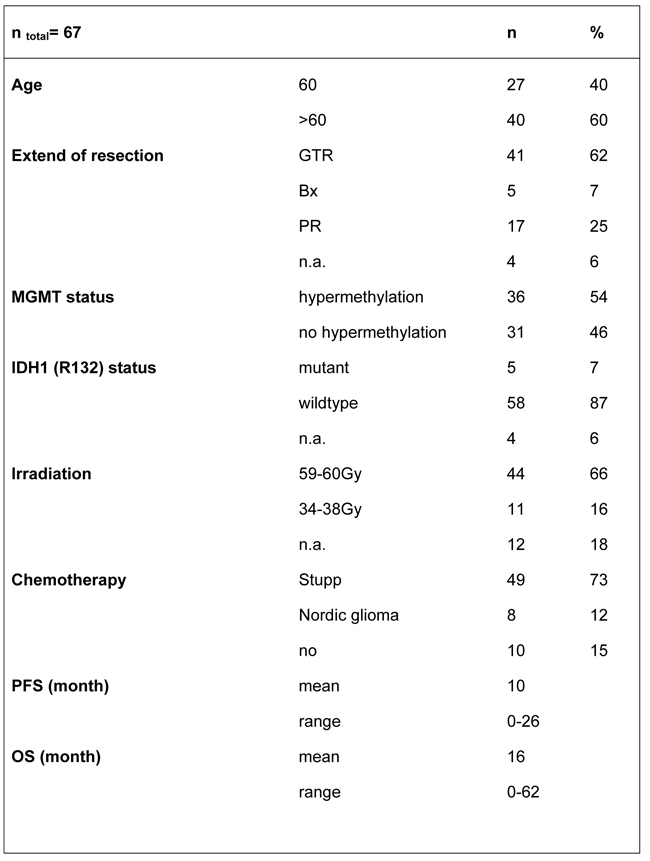 Clinical data were evaluated under an institutional review board-approved protocol and de-identified for patient confidentiality. We included 90 patients, who have been treated in our institution in the year 2012-2016. GBM diagnosis was confirmed by at least two neuropathologists. Age, tumor localization, Karnofsky performance status (KPS), O(6)-methylguanine-DNA methyltransferase (MGMT) status, isocitrate dehydrogenase 1 (IDH1 (R132)) mutation, extend of resection, adjuvant therapy (irradiation dosage and type/duration of chemotherapy treatment) and outcome data were recorded. Outcome measures were assessed with progression free survival (PFS) and overall survival (OS) in month according to RANO criteria [44]. Prognostic relevant factors like age, MGMT status, IDH status und extend of resection were taken into account for survival analysis. The extend of tumor resection was determined by measuring the contrast-enhancing residual tumor volume in mm3 on T1 subtraction MRI imaging using iPlan Net 3.0.0, BrainLAB AG, Feldkirchen, Germany. The extend of resection was defined as gross total resection (GTR) with residual tumor volume less than 1 cm3 according to Sanai et al. [45], partial resection (PR) with more than 1 cm3 residual tumor volume or biopsy in cases of stereotactic or open tumor biopsy. IDH1 (R132) mutation was assessed with immunohistochemistry (IHC). MGMT promoter methylation status was assessed based on previously published methods with methylation-specific polymerase chain reaction (MSP) and pyrosequencing (PSQ) [46]. Patient characteristics are displayed in Table 3.