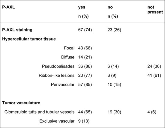 The following P-AXL expression patterns were detected: i) P-AXL expression exclusively in the tumor vasculature, ii) P-AXL expression in hypercellular areas of the tumor tissue, and iii) P-AXL expression in the tumor vasculature and in hypercellular areas of the tumor tissue. In pattern i) P-AXL expression was observed in vascular proliferates like glomeruloid tufts and tubular vessels. Within the GFAP-positive, hypercellular regions, the presence of P-AXL in herringbone-like areas or pseudopalisades was documented. The expression pattern of P-AXL within hypercellular regions was further classified as focal (10-50%) or diffuse (≥50%) and was independently assessed by two different, blinded experts.