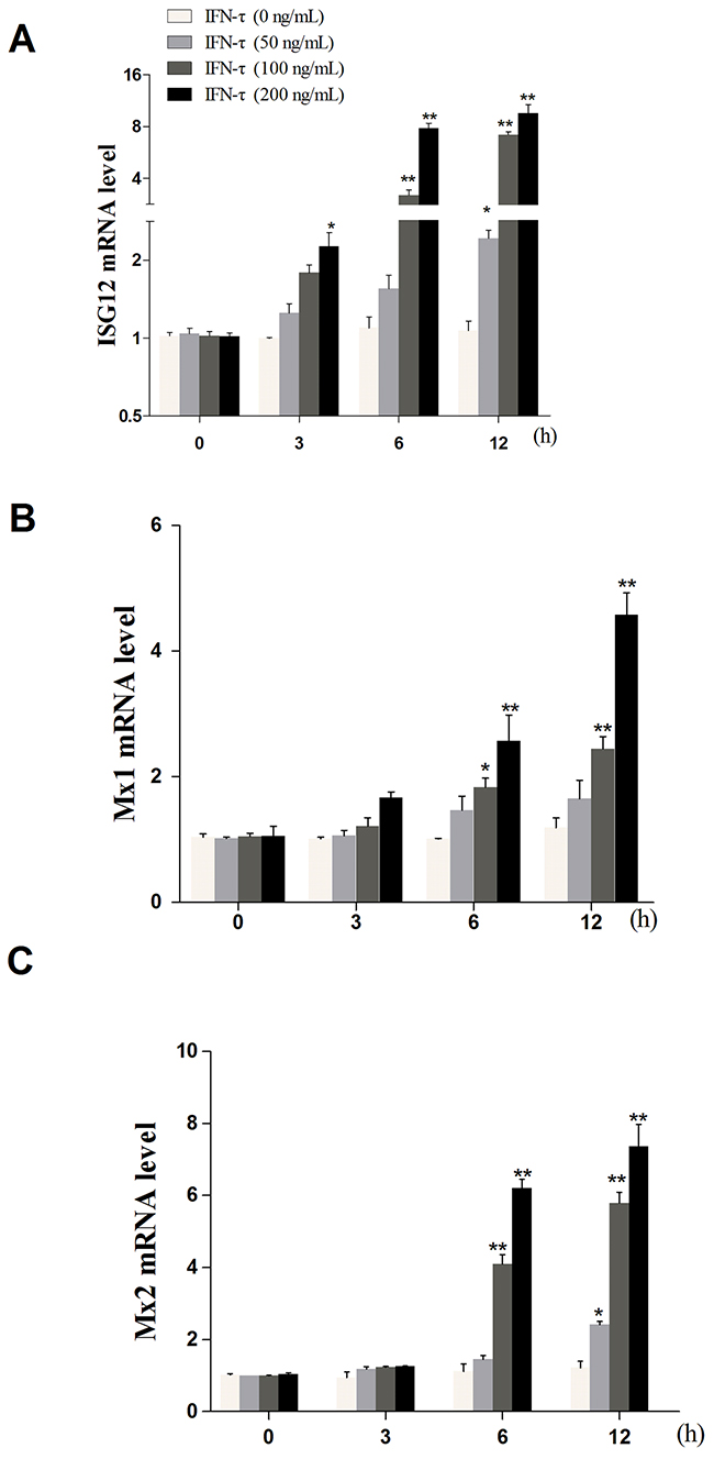 Figure 1: The effect of IFN-τon the expression of ISG12 (A), Mx1 (B), and Mx2 (C) mRNA. Primary bEECs were treated with different concentrations of IFN-τ (0, 50, 100, and 200 ng/mL) and then harvested at 0, 3, 6, and 12 h, respectively. The expression of target genes was determined by qPCR. β-actin was used as a control. Data represent the mean ± S.E.M. of three independent experiments. *p<0.05 vs. IFN-τ (0 ng/mL). **p<0.01 vs. IFN-τ (0 ng/mL).
