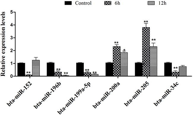 To validate the reliability of the sequencing data with the stem-loop PCR assay, we selected six abundantly differentially expressed miRNAs. The result is shown in Figure 3, which was consistent with the deep sequencing results.