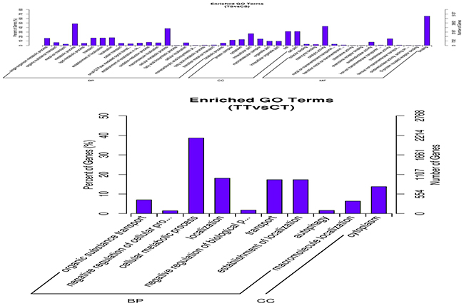 Figure 5: GO term of differentially expressed genes in bovine endometrial epithelial cells treated with IFN-τ. The Top 20 GO (biological process) term analyses of differentially expressed genes of the TS vs. CS group and TT vs. CT group. MF indicates molecular function; BP indicates biological process; and CC indicates cellular component.