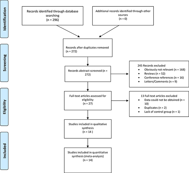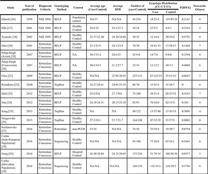 The search yielded a combined 272 references. Study selection process was shown in Figure 1. The final meta-analysis included a total of 14 articles of 16 data sets [16–29]. The 16 data sets included 1628 controls and 1478 PCOS cases. The detailed characteristics of included studies are shown in Table 1. Of the PCOS cases, 439 were Asian, 517 were Caucasian, 522 were Middle Eastern.