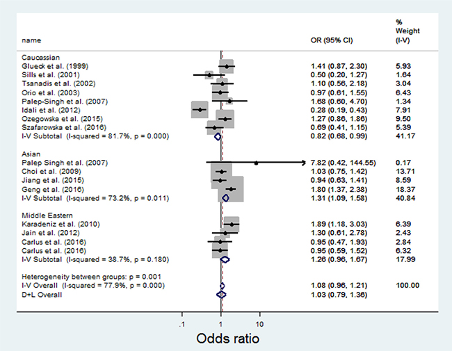 In the stratified analysis by ethnicity, the T allele significantly increases risks for the Asian [OR = 1.31; 95% CI: 1.09–1.58] population (See Figure 2). No significant associations were detected for the Middle Eastern [OR = 1.26; 95% CI: 0.96–1.67]. The T allele was found to be protective in the Caucasian population [OR = 0.82; 95% CI: 0.68–0.99].