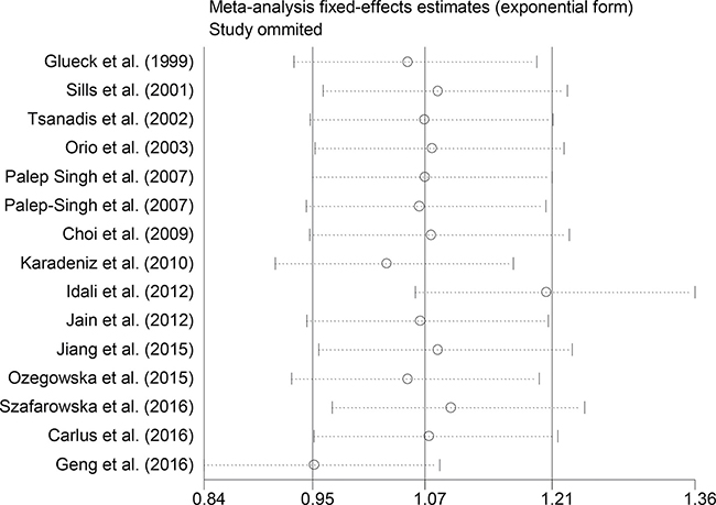 Sensitivity analyses using single-study omission demonstrated that this meta-analysis was stable (Figure 3). Statistical significance of the summary ORs was not modified (data not shown). A cumulative meta-analysis (Figure 4) also show that the results of this study are stable.