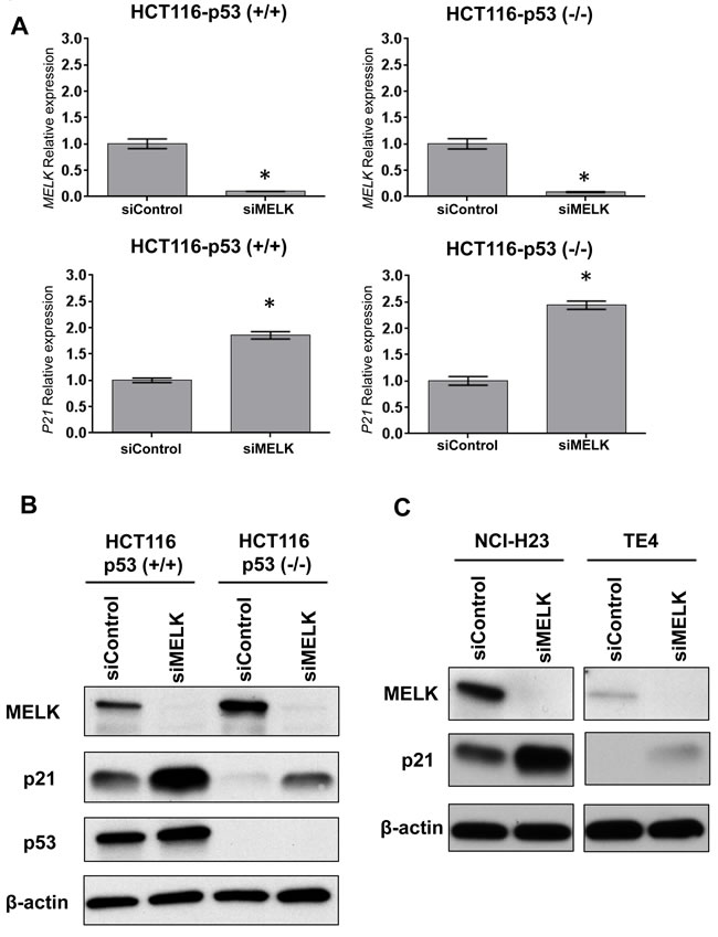 Figure 1: Knockdown effects of MELK in HCT116-p53 (+/+) and-p53 (-/-) cells. A.Depletion of MELK and induction of p21 at transcriptional levels were observed in both cell lines by siRNA-mediated MELK knockdown. The asterisk indicates p < 0.01 compared with the corresponding value of the siControl group. B. Depletion of MELK and induction of p21 at protein levels were observed in both cell lines by siRNA-mediated MELK knockdown. C. TE4 and NCI-H23 cell lines harboring loss-of-function TP53 mutations showed the increase of p21 protein after MELK knockdown.