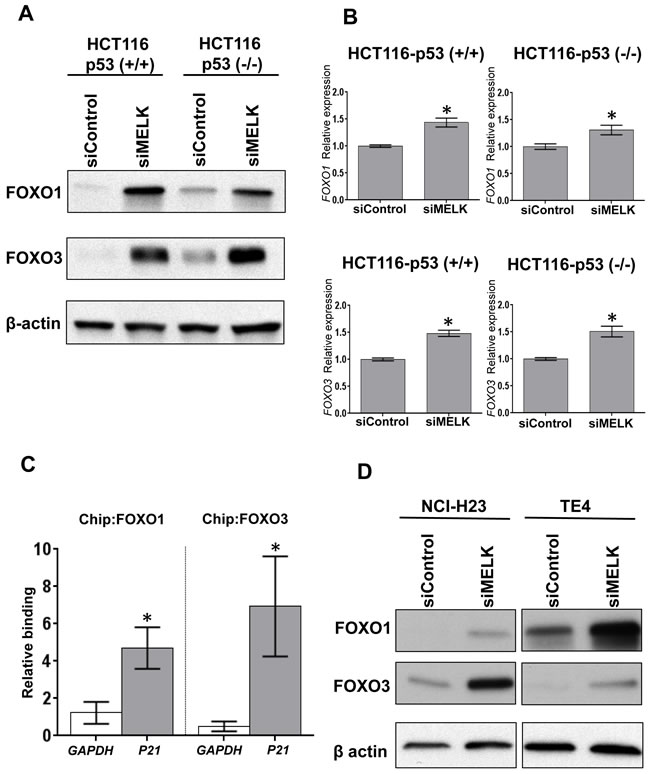 Figure 2: MELK knockdown increases FOXO1 and FOXO3 proteins. A. FOXO1 and FOXO3 were increased at protein level in both HCT116-p53(+/+) and -p53(-/-) cells by siRNA-mediated MELK knockdown. B. FOXO1 and FOXO3 were also increased at transcriptional level in both HCT116-p53(+/+) and -p53(-/-) cells by siRNA-mediated MELK knockdown. The asterisk indicates p < 0.01 compared with the corresponding value of the siControl group. C. Using HCT116-p53(-/-) cells, chromatin immunoprecipitation (ChIP) and qPCR were performed to quantify FOXO1- or FOXO3-bound DNA complex on the promoter region of p21 or GAPDH (negative control). The co-immunoprecipitated DNA of each antibody was normalized with that of normal IgG, and then its ratio of siMELK/siControl was calculated. The asterisk indicates p < 0.05 compared with the corresponding value of the GAPDH. D. NCI-H23 and TE4 harboring loss-of-function TP53 mutations showed the increase of FOXO1 and FOXO3 proteins after MELK knockdown.
