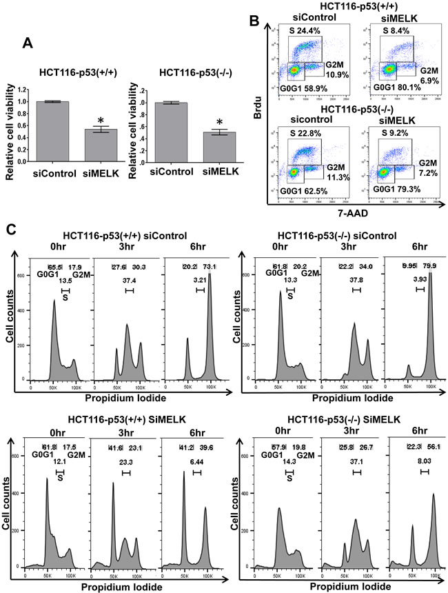 Figure 3: Cell cycle arrest at G1 phase by MELK knockdown. A. Silencing of MELK by siRNA reduced the number of viable cells on both HCT116-p53(+/+) and -p53(-/-) cells. The asterisk indicates p < 0.01 compared with the corresponding value of the siControl group. B. Cell cycle analysis was performed in HCT116-p53(+/+) and -p53(-/-) cells treated with siControl and siMELK for 48 hours. Bromodeoxyuridin (Brdu) staining and 7-aminoactinomycin D (7AAD) were used to analyze the cell cycle. C. FACS analysis of HCT116-p53(+/+) and -p53(-/-) cells treated with siControl and siMELK for 48 hours. Cells were collected at 0, 3, and 6 hours after the release of cell cycle arrest caused by aphidicolin.