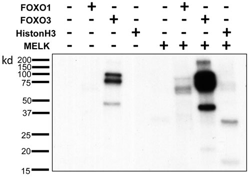 Figure 4: Direct FOXO1 and FOXO3 phosphorylation by MELK. In vitro kinase assay of recombinant FOXO1 and FOXO3 proteins with MELK recombinant protein. Recombinant histone H3 protein was used as a positive control.