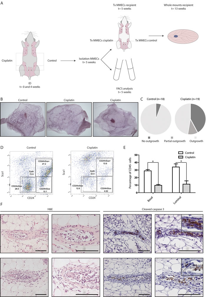 Figure 1: ID cisplatin treatment reduces epithelial viability and leads to an inhibition of mammary gland repopulation. A. Experimental set-up. Post-breeder mice were subjected to 2 ID cisplatin treatments with a 4-week interval in the right-sided glands number 3, 4, and 5. The contralateral corresponding mammary glands served as control. Next, MMECs were harvested and transplanted into syngeneic mice (upper part) or analyzed by FACS (lower part). B. and C. Cisplatin inhibits the mammary repopulating capacity. Depicted are representative samples of whole mount analyses, showing complete outgrowth after control treatment (B; left), rudimentary outgrowth (B; middle), or no outgrowth (B; right) after ID cisplatin treatment. Quantifications of the control (left pie chart) and ID cisplatin treated glands (right pie chart) are shown in (C). D. and E. ID cisplatin treatment leads to an overall reduction of MMECs. Representative plots of the basal and luminal cell populations using FACS analysis after control (D; left dot plot), or ID cisplatin treatment (D; right dot plot). Quantifications of basal and luminal MMECs are shown in (E). Basal MMECs were defined as DAPI-;CD45-;Sca-;CD24+/low and luminal MMECs as DAPI-;CD45-;Sca-or+;CD24+/hi. Shown is an average of 9 mice per condition. Error bars represent SEM; * = p < 0.05. F. Cisplatin-treated glands showed morphological changes matching apoptosis and an induction of cleaved caspase 3 expression in the epithelial lining of the mammary duct. Representative pictures of H&E and cleaved caspase 3 stainings of mammary gland tissue slides after ID cisplatin treatment are shown. Scale bar is 100 μm, upper right pictures are blow-ups of caspase 3 positive cells.