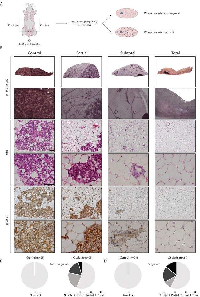 Figure 2: Functional effect of ID cisplatin on the mammary gland and pregnancy-induced lobulo-alveolar development. A. Experimental set-up. Post-breeder mice were subjected to two ID cisplatin treatments with a 4-week interval in the right-sided glands number 3, 4, and 5. The contralateral corresponding mammary glands served as control. Next, whole mounts were analyzed at day 17.5 of pregnancy or at a similar time point in non-pregnant mice. B. Representative pictures showing no effect in control (first column) or partial (second column), subtotal (third column), or total effect (fourth column) after ID cisplatin treatment. The top two rows show whole mount analyses, followed by H&E stainings, and β-casein IHC. Scale bar is 100 μm in lower magnifications and 50 μm in higher magnifications. C. ID cisplatin reduces ductal outgrowth in non-pregnant mice (n = 23). Quantifications of mammary ductal outgrowth after control (left chart) or ID cisplatin treatment (right chart). D. ID cisplatin reduces lobulo-alveolar development in pregnant mice (n = 21). Quantifications of mammary ductal outgrowth after control (left chart) or ID cisplatin treatment (right chart).