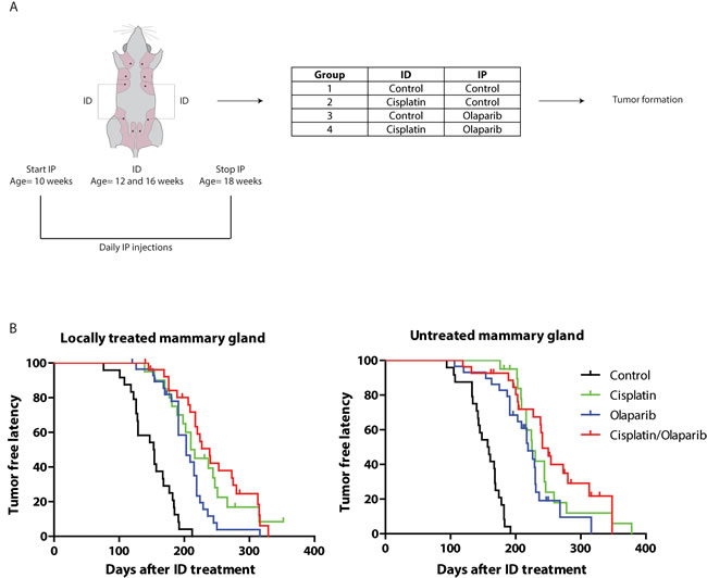 Figure 3: Combined prophylactic cisplatin and olaparib treatment in a WAPCre;Brca1F/F;Trp53F/F sporadic mouse model leads to a later onset of breast tumor formation. A. Experimental set-up. Virgin WAPCre;Brca1F/F;Trp53F/F were treated twice in glands number 3 and 4 with either control or cisplatin at the age of 12 and 16 weeks. During the ID treatments, mice were IP injected with control or olaparib on a daily basis from the age of 10 to 18 weeks. In total 4 treatment groups were analyzed, i.e. control (n = 24), ID cisplatin monotherapy (n = 20), IP olaparib monotherapy (n = 29) and ID cisplatin combined with IP olaparib combination therapy (n = 27). B. Kaplan-Meier curves showing the tumor-free latency post treatment of mammary glands tumor in the treated (glands number 3 and 4; left graph) and untreated mammary glands (glands number 1, 2, and 5; right graph).