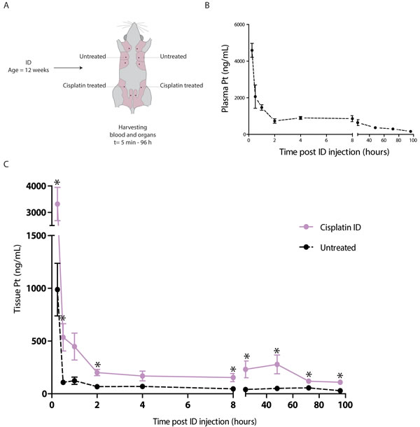 Mice were euthanized at 5 minutes, 15 minutes, 30 minutes, 1, 2, 4, 8, 24, 48, 72 and 96 hour intervals after ID injection. Blood was collected via cardiac puncture and tissue was isolated and frozen. Platinum concentrations were measured by a validated Inductively Coupled Plasma Mass Spectrometry (ICPMS) method as described by Brouwers et al. [60].