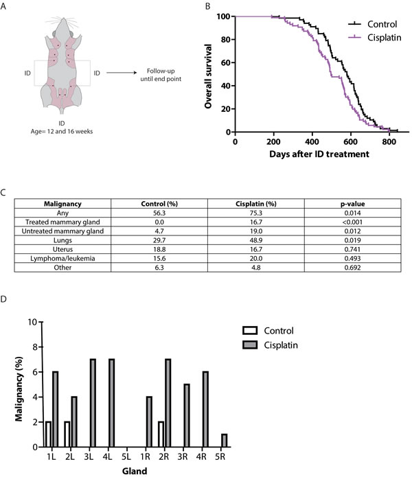 Figure 5: Long-term effects of ID cisplatin treatment. A. Experimental-set up. Virgin F1 (FVB/N;Ola129Hsd) mice were treated twice in glands 3 and 4 with either cisplatin or control at the age of 12 and 16 weeks. Next, mice were followed in time for tumor development. B. Kaplan-Meier curves showing overall survival of control (black line; n = 67) or ID cisplatin (pink line; n = 86) treated mice. C. Table showing the incidence of malignancies in control and ID cisplatin treated mice. The category ‘other tumors’ consisted of sarcoma of unknown origin, hemangiosarcoma of the spleen, carcinoma of the oral cavity, and squamous carcinoma in the anogenital region in control mice. In ID cisplatin treated mice ‘other tumors’ comprised hepatocellular carcinoma (n = 2), carcinoma of the salivary gland, and angiosarcoma in the mammary gland. D. Bar graph showing the breast tumor incidence in control and ID cisplatin treated mice per mammary gland.