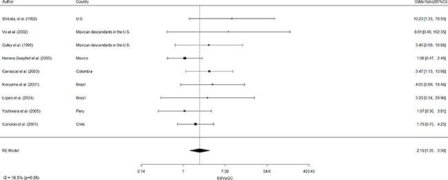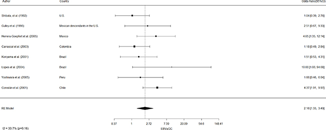 EBVaGC in the Americas was first reported by Shibata and coworkers [8]. These authors identified 22 of 138 (16%) EBV-positive cases in U.S. GC cases by in-situ hybridization of EBV-encoded small RNAs (EBERs) in tumor samples. In positive cases, EBERs were expressed exclusively in gastric tumor cells. No EBV sequences were detected in the surrounding lymphocytes or precancerous lesions, such as chronic gastritis or intestinal metaplasia. In addition, EBVaGCs were more frequently observed in males than females (p = 0.007). Subsequent studies by Gulley and coworkers [9] and Vo and coworkers [10], identified 11 of 95 (12%) and 9 of 43 (20%) EBV-positive GC cases, respectively, in Mexican descendants living in the U.S. However, only Vo et al. [10] confirmed male predominance (p = 0.01). Later, Herrera-Goepfert et al. [11] identified 24 of 330 (7.3%) EBV-positive cases in Mexico City. In this series, no male predominance was confirmed. Interestingly, all cases were of diffuse-type histology. In Colombia, Carrascal et al., [12] examined 178 consecutive gastric carcinoma cases identifying 23 (13%) cases of EBVaGCs. In this study, EBVaGCs were most often detected in males (p = 0.004), and located predominantly on the non-antrum stomach (p = 0.009). Koriyama et al., [13] examined 151 cases from Brazil, detecting 11.2% of EBVaGC. Although EBVaGC was most frequent among males (p = 0.047), Lopes and coworkers [14] did not confirm this finding in a posterior study. Another series consisting of 254 gastric cancer cases from Japanese descendants living in Peru were evaluated by Yoshiwara et al., [15], identifying only 3.9% EBVaGC (10 cases). In this series, no evident predominance by gender or histological subtype were detected. Finally, in Chile, Corvalan and coworkers [16] detected 31 of 185 (16.8%) EBV-positive gastric cancer cases. In this series, predominance of diffuse-type histology (p < 0.001) and non-antrum location (p = 0.01) were the most significant findings. No reports of EBVaGC have been described in other American countries. A consolidated overview of EBVaGC in the Americas is shown in Table 1. The meta-analytic estimated prevalence of EBV positivity in the region was 11.49% (95% CI = 8.46 to 15.43), with high heterogeneity among studies (I2 = 73.3%; p < 0.001). Interestingly, heterogeneity for predominant sex, location and histology was low (I2=16.5% [p = 0.35]; 0% [p = 0.68] and 33.7% [p = 0.16], respectively). Univariate analysis shows male predominance (p < 0.001), non-antrum location (p < 0.001) and diffuse-type histology (p < 0.001) as the most significant features of EBVaGC in the Americas. Odds-ratio estimated for male predominance and diffuse histology were 2.19 (95% CI: 1.35–3.56) and 2.16 (95% CI: 1.33–3.49), respectively (see Figure 1 and Figure 2).
