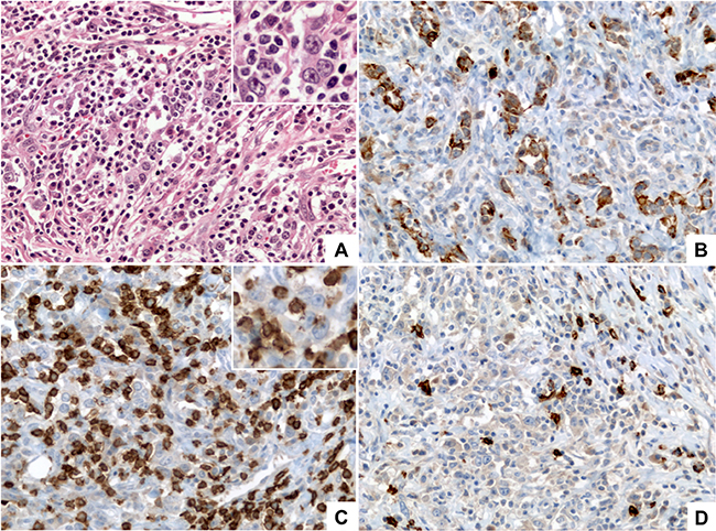 Figure 3: Lymphoepithelioma-like (LEL) carcinoma. (A) (HE, 400×) shows a poorly differentiated carcinoma formed by medium to large size tumor cells with vesicular nuclei, prominent nucleoli and small amount of eosinophilic cytoplasm (inset) arranged in small clusters and poorly formed cords, intermingled with numerous lymphocytes. (B) (Pan-Cytokeratin AE1/AE3, 400×) shows that the tumor cells are positive for cytokeratins demonstrating their epithelial nature and highlighting the poorly formed clusters and cords arrangement. (C) (CD3, 400×) highlights the diffuse lymphocytic infiltrate composed mainly by mature T lymphocytes; tumor cells are negative for CD3 (inset). (D) (CD20, 400×) highlights scattered B-lymphocytes within the infiltrate.