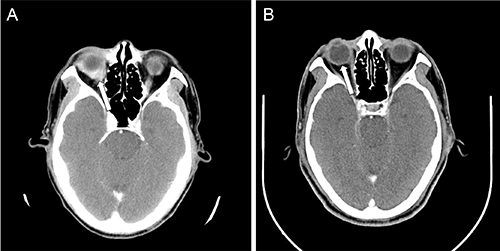 Figure 1: The CT scan of the brain with contrast showing (A) before treatment, the enhanced soft tissue infiltrates the right eyeball (arrow); and (B) after four cycles of R-CHOP, the tissue resolved with CR.