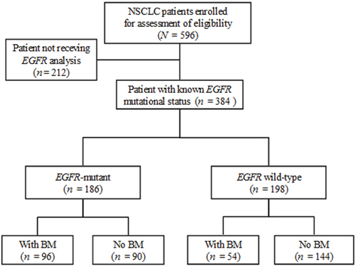 Figure 1: Flow chart of patient selection for further analysis. Of the 596 non-small cell lung cancer (NSCLC) patients, 384 with a determined epidermal growth factor receptor (EGFR) mutation status, including 186 (48.4%, 186/384) with any or combined mutations of EGFR exon 18 to 21 and 198 with wild-type (WT) EGFR, were eligible for the identification of brain metastases (BM).