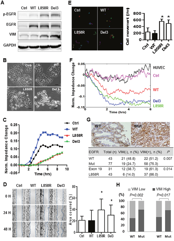 EGFR tyrosine kinase inhibitors (TKI), such as gefitinib, erlotinib or afatinib, preferentially target lung tumors with mutated-EGFRs, but not the wild-type EGFR (WT-EGFR) tumors, suggesting that the mutated- and WT-EGFRs have different oncogenic effects. EGFR protein expression was previously detected in various solid tumors, and EGFR expression correlated with cell migration/invasion in breast and oral cancer cell lines [11–13]. However, the ability of EGFR to enhance cell motility is ligand-dependent [11–13]. The participation of activating EGFR mutations in lung cancer cell mobility is unknown.