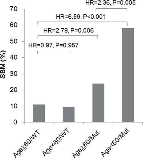 Figure 4: Risks for SBM in stage IIIB-IV NSCLC patients without BM at the time of lung cancer diagnosis, characterized by age and EGFR mutation status. Comparison was conducted using a time-to-event analysis considering death as a competing risk (Fine and Gray's sub-distribution hazard model). P value < 0.05 was considered as significant.