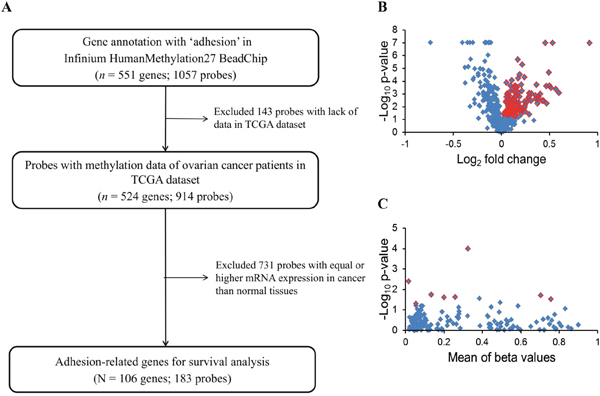 Figure 1: Flowchart of the present study. (A) Adhesion-related genes from the Infinium HumanMethylation27 array were selected to integrate the GeneChip HT Human Genome U133 array data to select candidate genes with an mRNA expression significantly lower in malignant than in normal samples (p < 0.05) for survival analysis. (B) Selection of genes differentially expressed in normal and malignant samples from an expression microarray. Blue dots indicate 428 adhesion-related genes. The expression of 106 genes shown as red dots was significantly different between normal and malignant tissues (p < 0.05 by t-test). (C) There was a significant association of eight genes in TCGA ovarian cancer patients with PFS by a log-rank test (red dots) of 183 probes (blue dots).