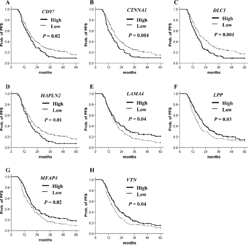 We identified novel methylated adhesion-related genes that can predict PFS in ovarian cancer by integration of methylomics and genomics analyses. We proposed a methylation gene signature with CTNNA1, DCL1, and MFAP4, which can further identify those patients with a poor prognosis. The potential of this methylation signature was validated in independent datasets. Using this methylation signature can help us to identify those who may have a poor response to current treatment, and delivery of customized epigenetic and targeted therapies might improve the outcome. The detection of tumor-specific methylation in cell-free DNA from serum or plasma is appealing [61]. The clinical application of DNA methylation signature testing using cell-free DNA warrants further investigation.