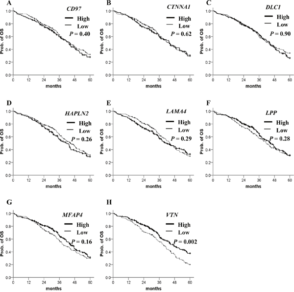 To evaluate their clinical relevance, we analyzed the prognostic significance of methylation status of 106 genes using a dataset from The Cancer Genomic Atlas (TCGA). The patient clinicopathological features are presented in Table 1. Most of the ovarian cancer patients at diagnosis were at stage III/IV and high grade. The β-value distribution of candidate genes is presented in Table 2. By Kaplan–Meier analysis, patients with highly methylated CD97, CTNNA1, DLC1, HAPLN2 and low methylation of LAMA4, LPP, MFAP4, VTN showed a significantly worse prognosis (Figure 2). In multivariate Cox regression analysis, FIGO stage was significantly correlated with PFS (Table 3). After adjusting for the stage, four highly methylated genes (CD97, CTNNA1, DLC1, HAPLN2) and three genes (LAMA4, LPP, MFAP4) with low methylation were found significantly associated with poor PFS (Table 3). In the Kaplan–Meier analysis for OS, only low methylation of VTN was significant for poor OS (Figure 3). Low methylation of VTN was an independent prognostic factor for OS after adjusting for age and stage (Table 4).
