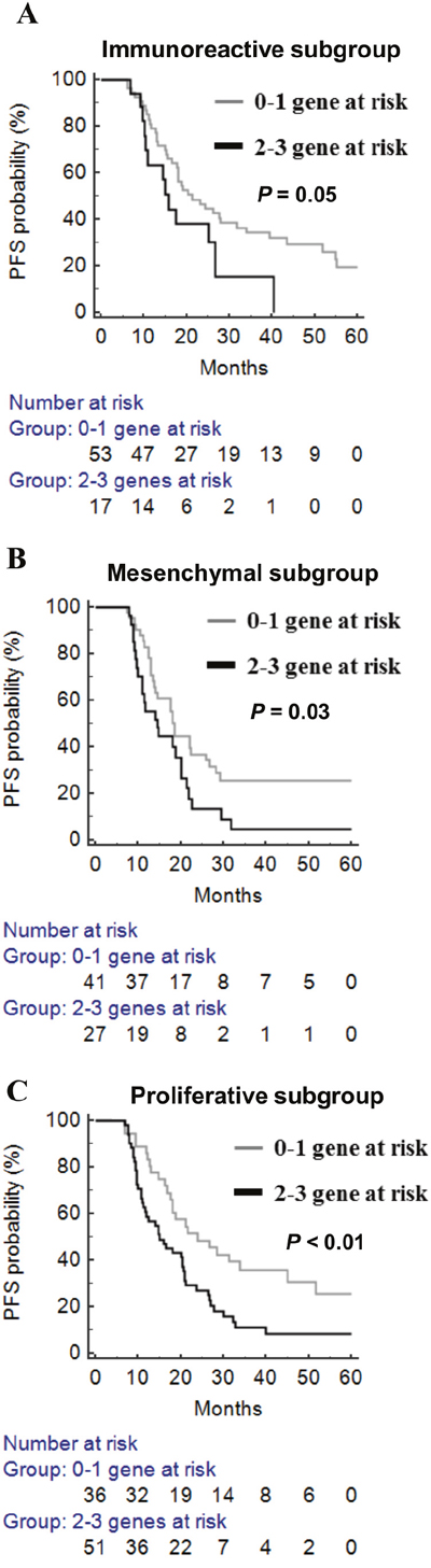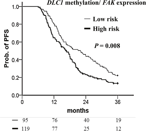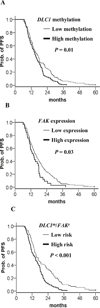 Figure 7: Kaplan–Meier curves of the risk groups in TCGA ovarian cancer patients with suboptimal debulking and the probability of PFS predicted by the DLC1 methylation status, FAK expression status, and combined signatures. PFS stratified by (A) DLC1 methylation status. Straight line: low methylation; bold line: high methylation. (B) FAK expression status. Straight line: low expression; bold line: high methylation. (C) DLC1 methylation and FAK expression signature. Straight line: low-risk; bold line: high-risk. Low risk means DLC1 low methylation and FAK low expression. The high-risk group included any combination of DLC1 methylation with FAK expression other than the low-risk group. P values were calculated using a log-rank test.