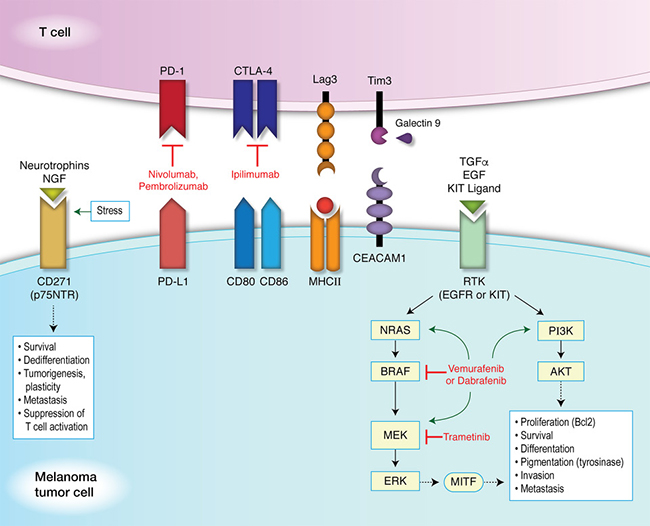 Figure 1: Targeted and immunotherapy against immune inhibitory receptors and resistance mechanisms. Immune inhibitory receptors and their ligands are paired as shown. Neurotrophins and nerve growth factors (NGF) bind to CD271 (p75NTR), whose expression can be induced under conditions of stress, resulting in downstream signaling pathways promoting survival, dedifferentiation, tumorigenesis, plasticity, metastasis, and the suppression of T cell activation. Transforming growth factor-α (TGFα), epidermal growth factor (EGF), and KIT ligand (stem cell factor or STEEL) can bind to a receptor tyrosine kinase (RTK), such as the EGF receptor (EGFR) or KIT receptor (c-KIT receptor or CD117). This promotes the activation of either the MAPK pathway or PI3K/AKT pathway. Kinase inhibitors can induce mutations in components of either pathway, as shown by green arrows. These induced mutations then promote the activation of downstream signaling, bypassing the targeted inhibition and resulting in the phosphorylation of microphthalmia-associated transcription factor (MITF). Expression of MITF leads to differentiation and pigmentation (via tyrosinase activity) as well as the proliferation and survival of melanocytes (through the upregulation of Bcl2). Activation of these pathways also promotes invasion and metastasis in melanoma tumor cells. Tim3 (HAVCR2) forms a heterodimer with CEACAM1 (carcinoembryonic antigen-related cell adhesion molecule) inducing T cell inhibition, and also binds its ligand, Galectin 9 to then suppress T helper cell type 1 (Th1) function and induce cell death.