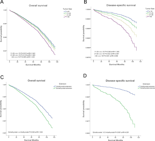 Figure 1: Overall survival (OS) and disease-specific survival (DSS) curves of multivariate Cox analysis. (A) OS is based on tumor size. (B) DSS is based on tumor size. (C) OS is based on tumor extension. (D) DSS is based on tumor extension.