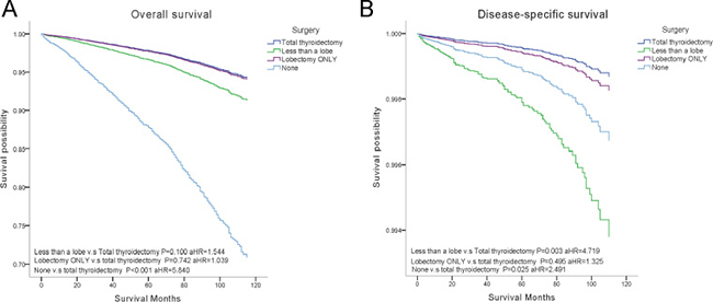 Patients who underwent radioisotopes had significantly better OS (aHR = 0.659, P < 0.001), but showed no differences on DSS, even by subgroup analysis, DSS was not improved by radioisotopes. Surgical treatments did not reveal statistical differences in OS (ten-year survival rates of total thyroidectomy 96.4%, lobectomy 95.9%), except that removal of less than a lobe displayed significantly decreased DSS (aHR = 4.719, P = 0.003) (Figure 2).