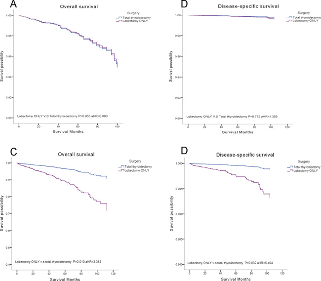Figure 3: Overall survival (OS) and disease-specific survival (DSS) curves of multivariate Cox analysis in subgroup analysis. (A) OS is based on surgical treatment in tumor < 2 cm with extrathyroidal extension. (B) DSS is based on surgical treatment in tumor < 2 cm with extrathyroidal extension. (C) OS is based on surgical treatment in tumor >2 cm with extrathyroidal extension. (D) DSS is based on surgical treatment in tumor > 2 cm with extrathyroidal extension.