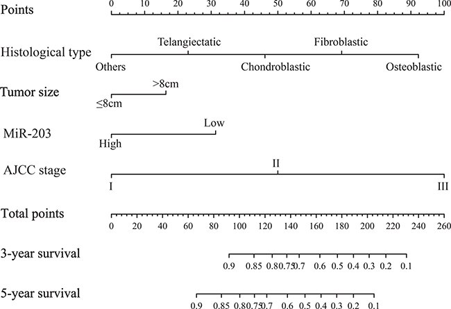 Figure 2: Evaluation of nomogram integrated miR-203 and clinicopathological factors in the patients with non-metastatic osteosarcoma. To use the nomogram, the value attributed to an individual patient is located on each variable axis, and a line is drawn upwards to determine the number of points received for each variable value. The sum of these numbers is located on the total points axis, and a line is drawn downward to the survival axis to determine the likelihood of 3- or 5-year survival.