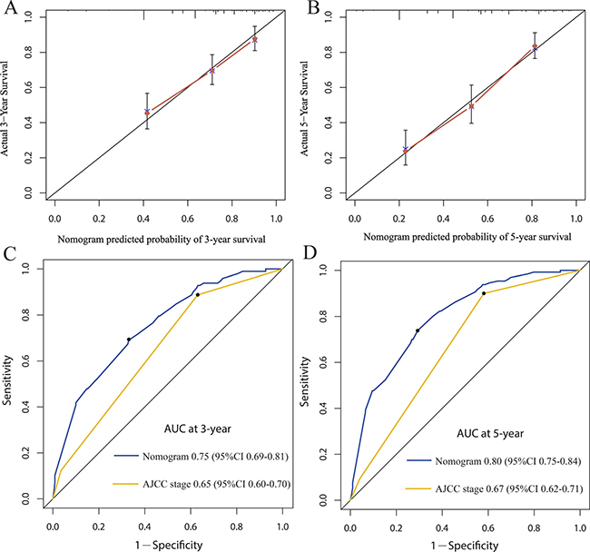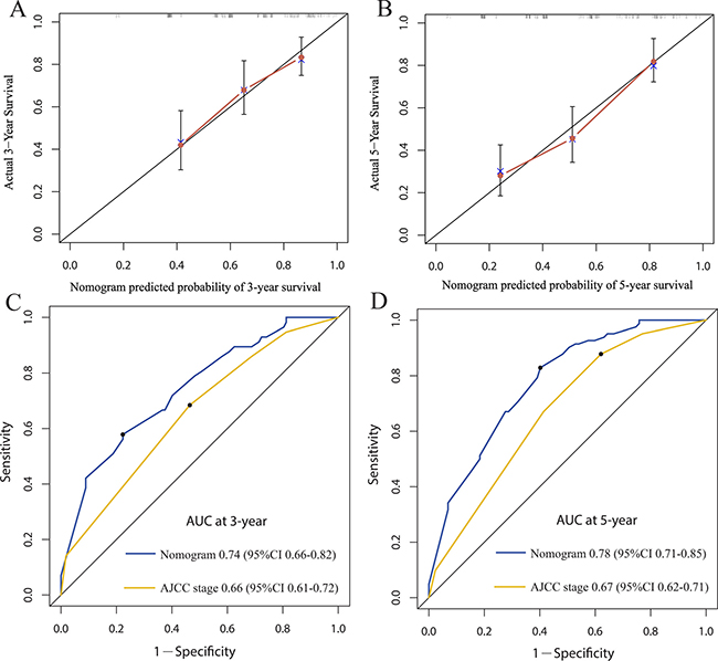 Figure 5: The calibration curve for predicting patient survival at 3-year (A) and 5-year (B) in the validation cohort. Time-dependent receiver operating characteristic (ROC) curves by nomogram and 7th AJCC-TNM staging system for 3-year (C) and 5-year (D) OS in the validation cohort.