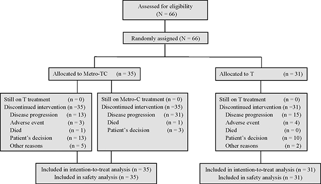 At the time of analysis, with median follow-up time of 40 months, 65 patients (34 patients in Metro-TC group; 31 in T group) had experienced disease progression, whereas 34 patients (18 patients in Metro-TC group; 16 in T group) had died.