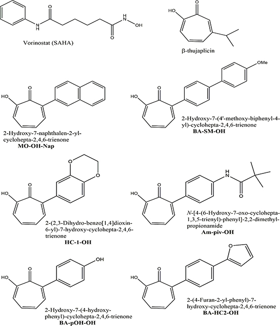 It was previously demonstrated that some tropolones can inhibit select histone deacetylases (HDACs), including HDAC2 and HDAC8 [13]. Targeting histone acetylation in cancer cells can lead to reprogramming of the epigenetic state and alterations in gene expression that make the cells more vulnerable to killing. Identification of novel, more selective HDAC inhibitors could prove clinically useful. Currently, pan-HDAC inhibitors are used for the treatment of select hematological malignancies. For example, vorinostat (suberoylanilide hydroxamic acid, SAHA) and romidepsin are used to treat cutaneous T-cell lymphoma [14]. Another pan-HDAC inhibitor, panobinostat, has been approved for use in combination with the proteasome inhibitor bortezomib in relapsed/refractory multiple myeloma [15]. In addition, several clinical trials have demonstrated the activity of panobinostat when used in combination with other standard myeloma therapies, including carfilzomib (a proteasome inhibitor) and thalidomide (an immunomodulatory agent) [16, 17]. The clinically utilized pan-HDAC inhibitors are associated with a variety of side effects, which may in part be due to their lack of specificity with respect to HDACs.