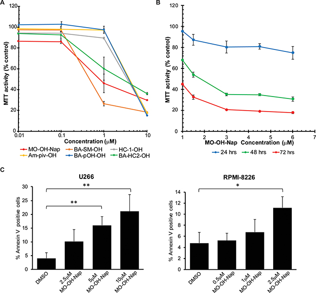 Figure 2: The novel tropolones induce cytotoxic effects in myeloma cells. (A) MTT assays were performed following a 48-hour incubation period with the tropolones in RPMI-8226 cells. (B) Time-dependent effects of MO-OH-Nap in RPMI-8226 cells. Data are expressed as percentage of control (mean + standard deviation, n = 4). (C) U266 and (D) RPMI-8226 cells were treated with DMSO (solvent control) or MO-OH-Nap for 48 hours. Cells were stained with fluorescently conjugated Annexin V and 7-AAD and analyzed by flow cytometry. Data are expressed as the average percentage of Annexin V-positive, 7-AAD-negative cells (n = 3, error bars denote standard deviation, *denotes p < 0.05. **denotes p < 0.01).