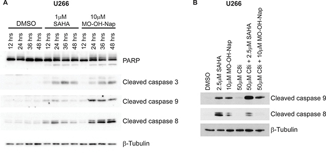 Figure 4: MO-OH-Nap induces caspase cleavage in a time-dependent manner which is distinct from the pan-HDAC inhibitor SAHA. (A) U266 cells were incubated for 12-48 hours in the presence or absence of SAHA (1 μM) or MO-OH-Nap (10 μM). Whole cell lysate was obtained and immunoblot analysis of PARP, cleaved caspases-3, -8 and -9 was performed along with β-tubulin as a loading control. The gels are representative of three independent experiments. (B) U266 cells were incubated for 24 hours in the presence or absence of a caspase-8 inhibitor (Z-IETD-FMK, C8i, 50 μM) and/or SAHA (2.5 μM) or MO-OH-Nap (10 μM). Whole cell lysate was obtained and immunoblot analysis of cleaved caspases-8 and -9 was performed along with β-tubulin as a loading control. The gels are representative of three independent experiments.