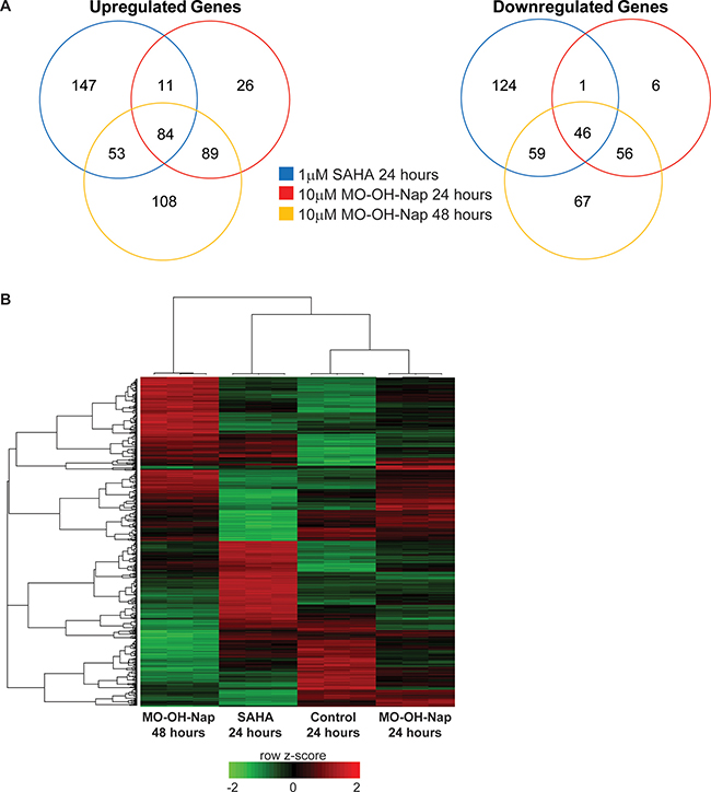 Figure 5: MO-OH-Nap and SAHA induce distinct patterns of gene expression. (A) Venn diagrams showing overlaps in gene expression for upregulated and downregulated genes in SAHA-24 hour (blue), MO-OH-Nap-24 hour (red) and MO-OH-Nap-48 hour (yellow) treated cells relative to the untreated control. (B) Heatmap of differentially expressed in the four treatment groups. Unsupervised hierarchical clustering is shown for individual genes (left) and samples (top). The color key shows row z-scores in which red denotes highly expressed genes and green denotes lowly expressed genes.