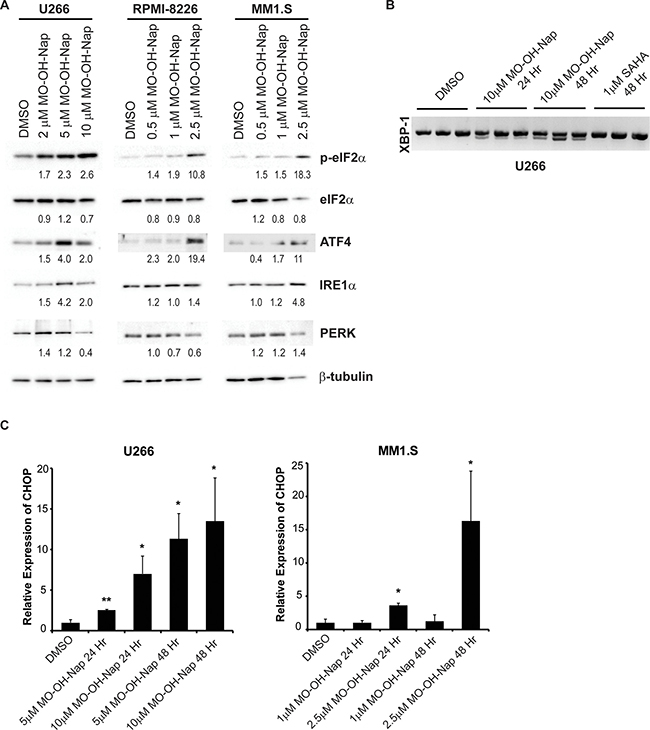 Figure 6: MO-OH-Nap induces markers of the unfolded protein response pathway. (A) U266, RPMI-8226, and MM1.S cells were incubated in the presence or absence of DMSO (solvent control) or MO-OH-Nap for 48 hours. Immunoblot analysis of phosphorylated eIF2α (p-eIF2α), eIF2α, ATF4, IRE1α, and PERK was performed along with β-tubulin as a loading control. Densitometric analysis of UPR proteins (normalized to β-tubulin) for the treated cells normalized to DMSO (solvent control) cells is shown. (B) U266 cells were incubated for 24 or 48 hours with solvent control, SAHA, or MO-OH-Nap in triplicate. RNA was isolated, cDNA prepared, and PCR was performed using XBP-1-specific primers. The upper band represents unspliced XBP-1 and the lower band represents spliced XBP-1. (C) qRT-PCR analysis of CHOP expression in U266 and MM1.S cells incubated in the presence or absence of DMSO (solvent control) or MO-OH-Nap for 24 or 48 hours. Data represents fold change normalized to DMSO control. (n = 3 independent experiments, error bars denote standard error, *denotes p < 0.05. **denotes p < 0.01).